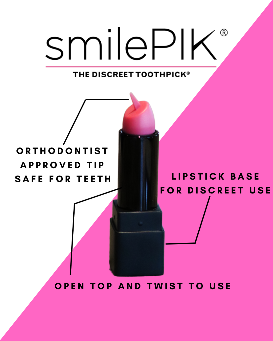 In order to develop smilePIK I asked myself, what is something I do naturally at the table that would not look out of order or different? As I was out to eat one day eating some tacos with a colleague I went to check on my make-up and lipstick as I normally do after eating, and as I looked in the mirror while I was holding my lipstick I actually noticed that I had gotten some cilantro stuck in my teeth, but I also noticed that if I was holding a toothpick disguised as lipstick I could have handled that little piece of cilantro right then and there. And that is how smilePIK was born! After this lunch I went to work using the best materials that are in the toothpicks that I approve for my orthodontist clients and developed them to be disguised as lipstick.